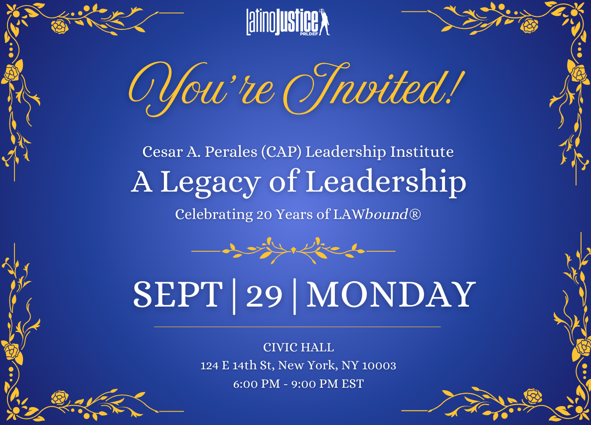 Join LatinoJustice PRLDEF’s Líderes Young Professionals Board for our annual fundraising and networking event. We will recognize young attorneys making an impact as they kick off their legal professions while raising funds for LatinoJustice’s work and John Garcia Legacy Interns.For more information on tickets and sponsorship, contact [email protected]