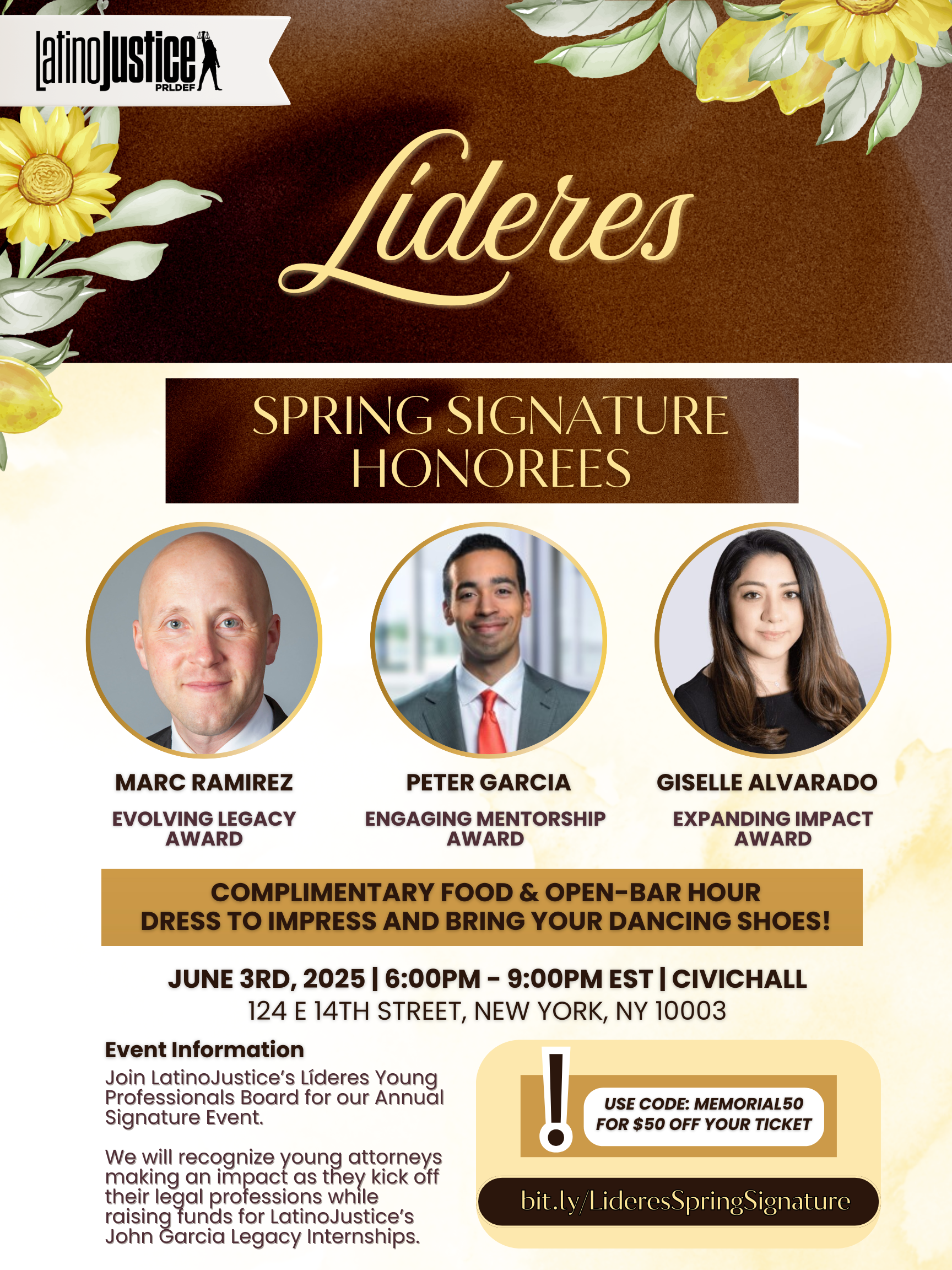 Join LatinoJustice’s Líderes Young Professionals Board for our Annual Signature Event. We will recognize young attorneys making an impact as they kick off their legal professions while raising funds for LatinoJustice’s work and John Garcia Legacy Interns.We look forward to working with you to celebrate our Líderes Young Professionals Board and their peers.